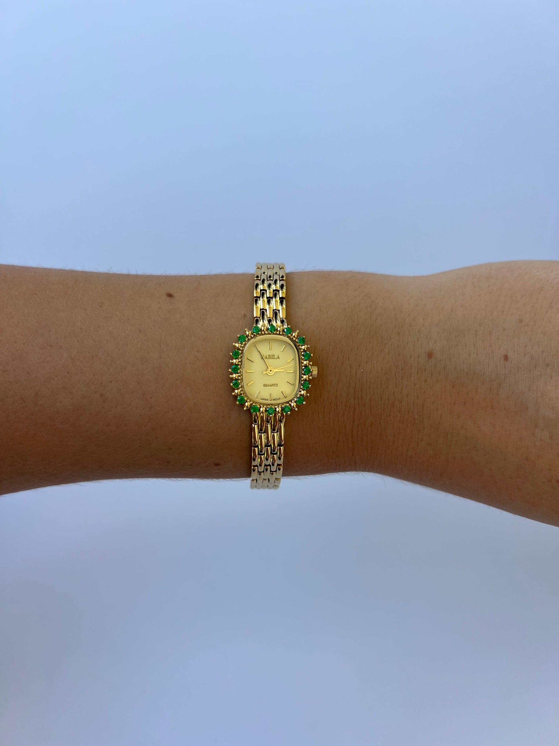 Green Accent Womens Oval Classic Vintage Quartz Watch Wristwatch Gold tone