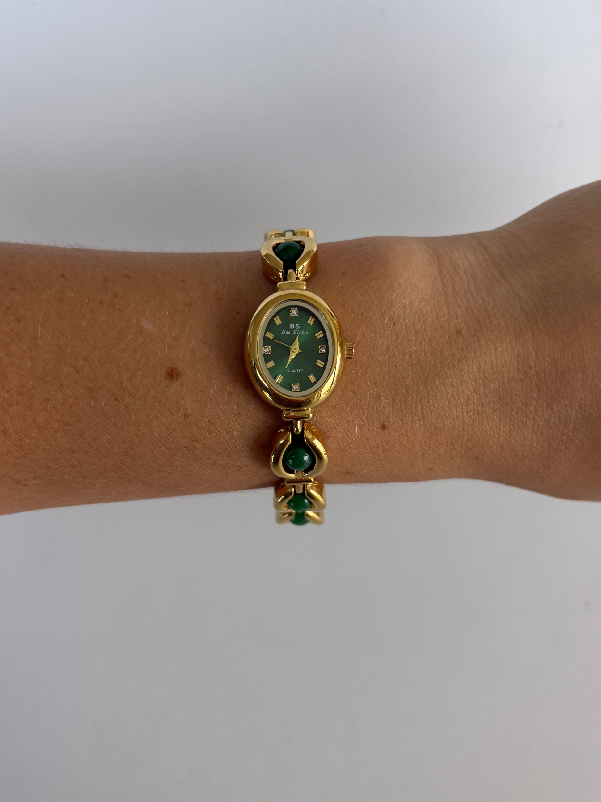 Vintage Pearl Drop Green Gold Womens Watch Dainty Small Face